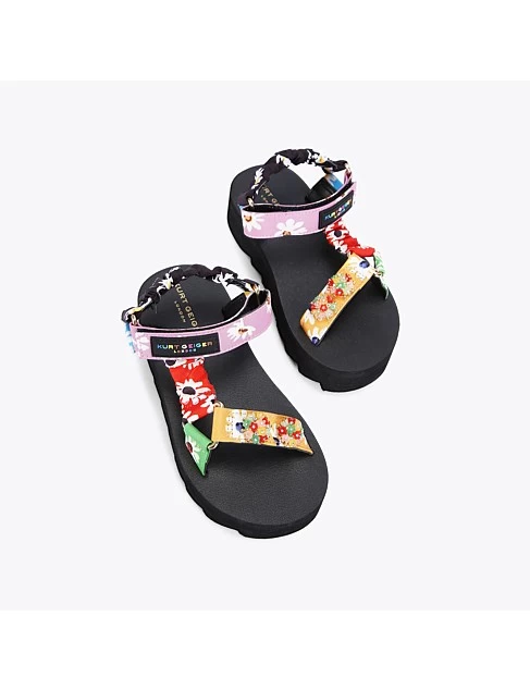 The Mini Orion sandal is crafted from a floral printed its multi-colour straps. The toe strap is adorned with multi-colour flower motifs. There is a branded rubber patch on the ankle strap.