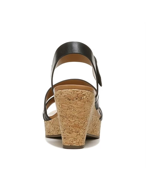 A strappy sandal with a whole lot of wedge. A faux wood or cork heel adds some interest to all your looks. Get there beautifully.
